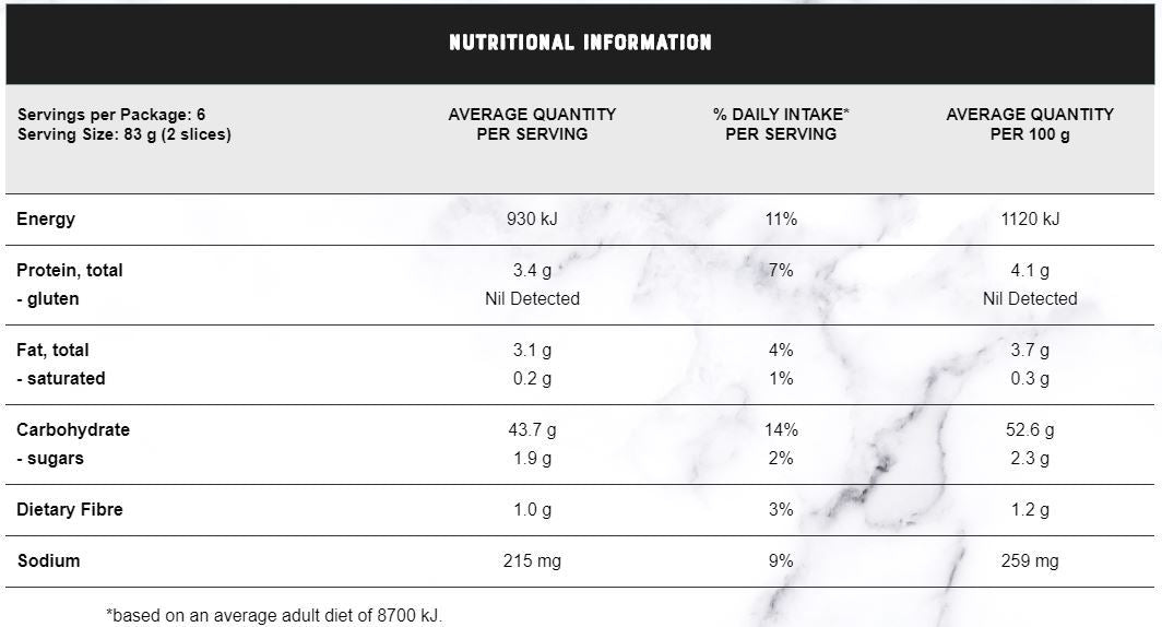 Modified Tapioca Starch (1442), Water, Rice Flour, Canola Oil, Sugar, Egg White Powder, Baker's Yeast, Molasses, Iodised Salt, Vinegar, Thickeners (464, 466).