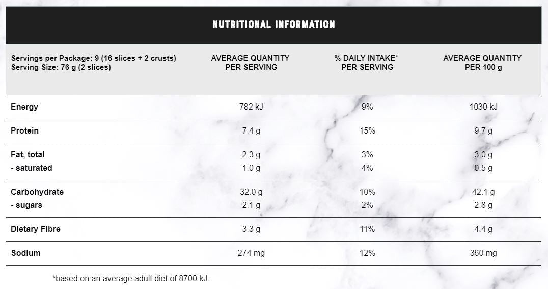 Wheat Flour, Water, Rye Flour (11%), Rye Meal (5%), Baker’s Yeast, Wheat Gluten, Vinegar, Iodised Salt, Canola Oil, Barley Malt Flour (0.3%), Soy Flour, Emulsifiers (471, 472e, 481), Vitamins (Thiamin, Folic Acid).