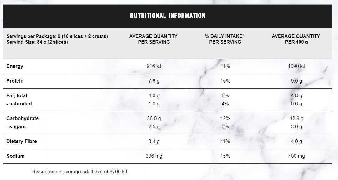 Wheat Flour, Water, Seeds (7%) (Canola Seed (4%), Linseed (1.5%), Sunflower Seed (0.6%), Sesame Seeds (0.3%), Pumpkin Seed), Mixed Grains (7%) (Kibbled Rye, Kibbled Wheat, Kibbled Triticale), Bakers Yeast, Vinegar, Iodised Salt, Canola Oil, Wheat Gluten, Soy Flour, Emulsifiers (471, 472e, 481), Vitamins (Thiamin, Folic Acid).