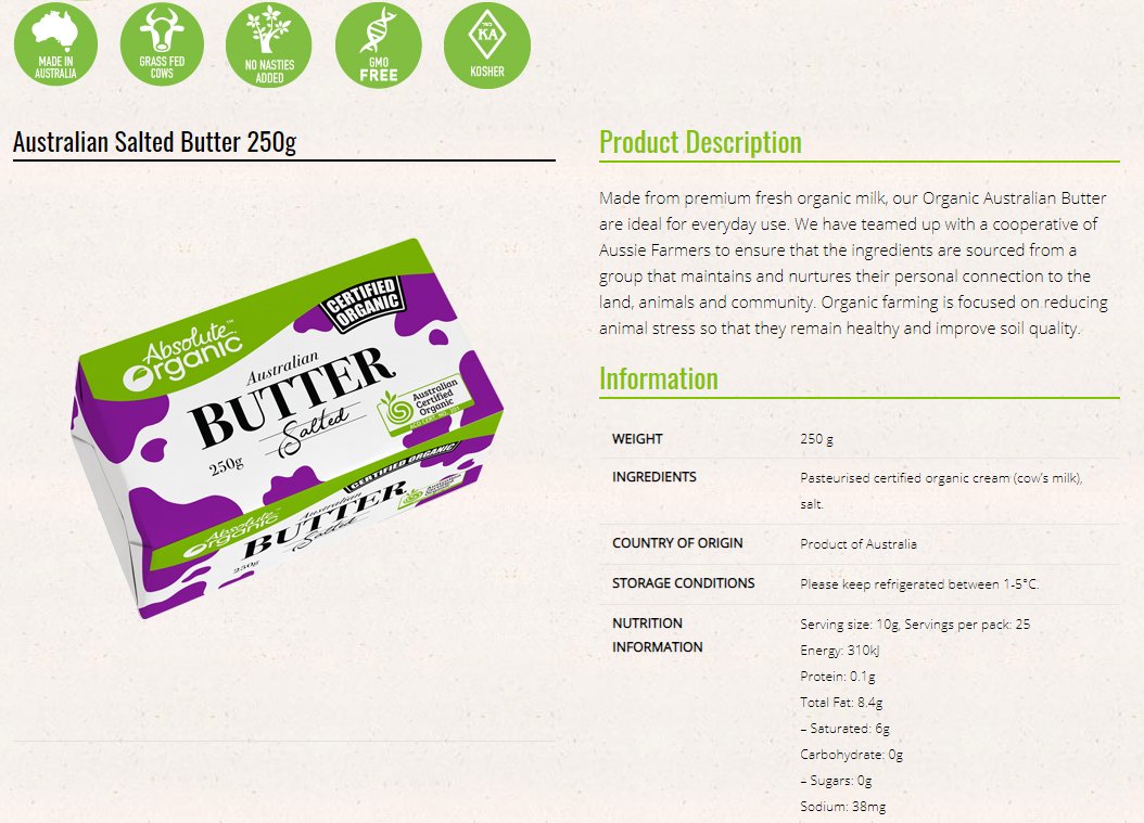 Made from premium fresh organic milk, our Organic Australian Butter are ideal for everyday use. We have teamed up with a cooperative of Aussie Farmers to ensure that the ingredients are sourced from a group that maintains and nurtures their personal connection to the land, animals and community. Organic farming is focused on reducing animal stress so that they remain healthy and improve soil quality.