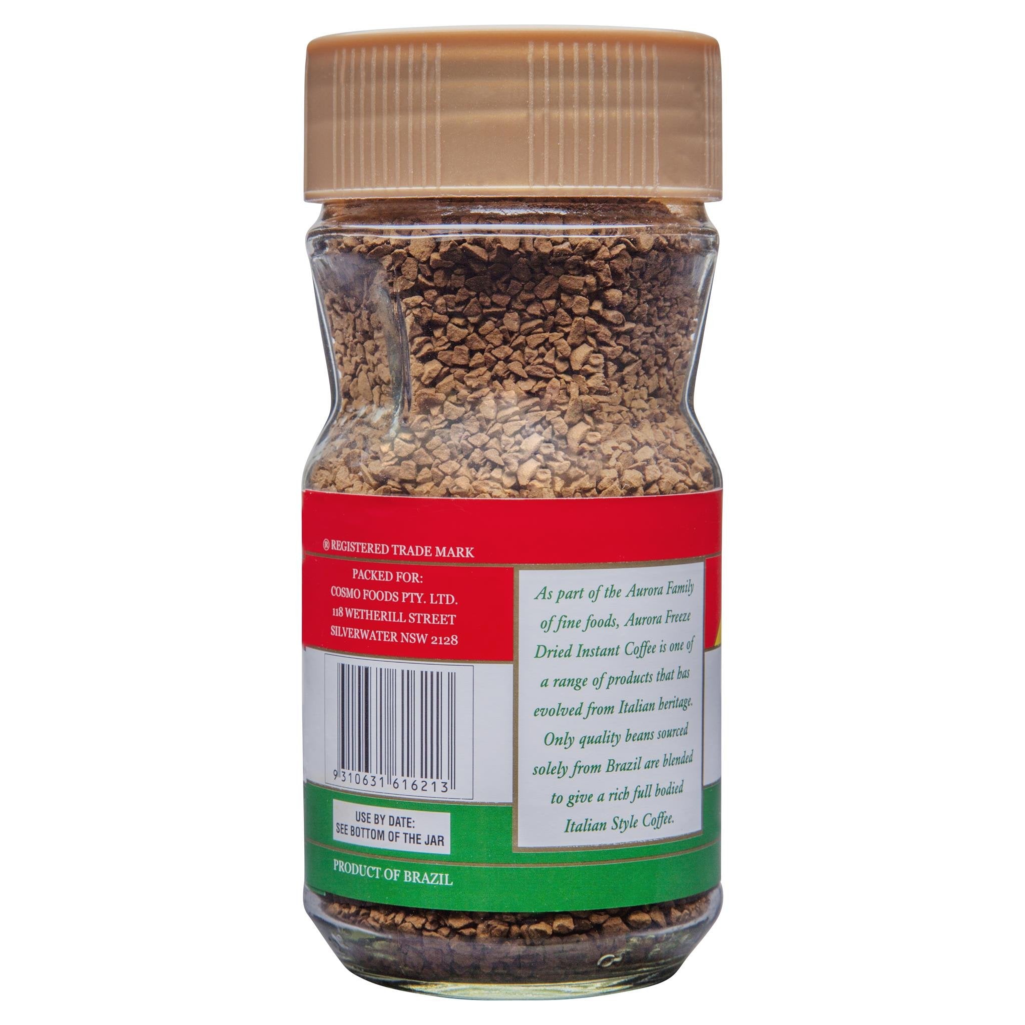 As part of the Aurora Family of fine foods, Aurora Freeze Dried Instant Coffee is one of a range of products that has evolved from Italian heritage. Only quality beans sourced solely from Brazil are blended to give a rich full bodied Italian Style Coffee.